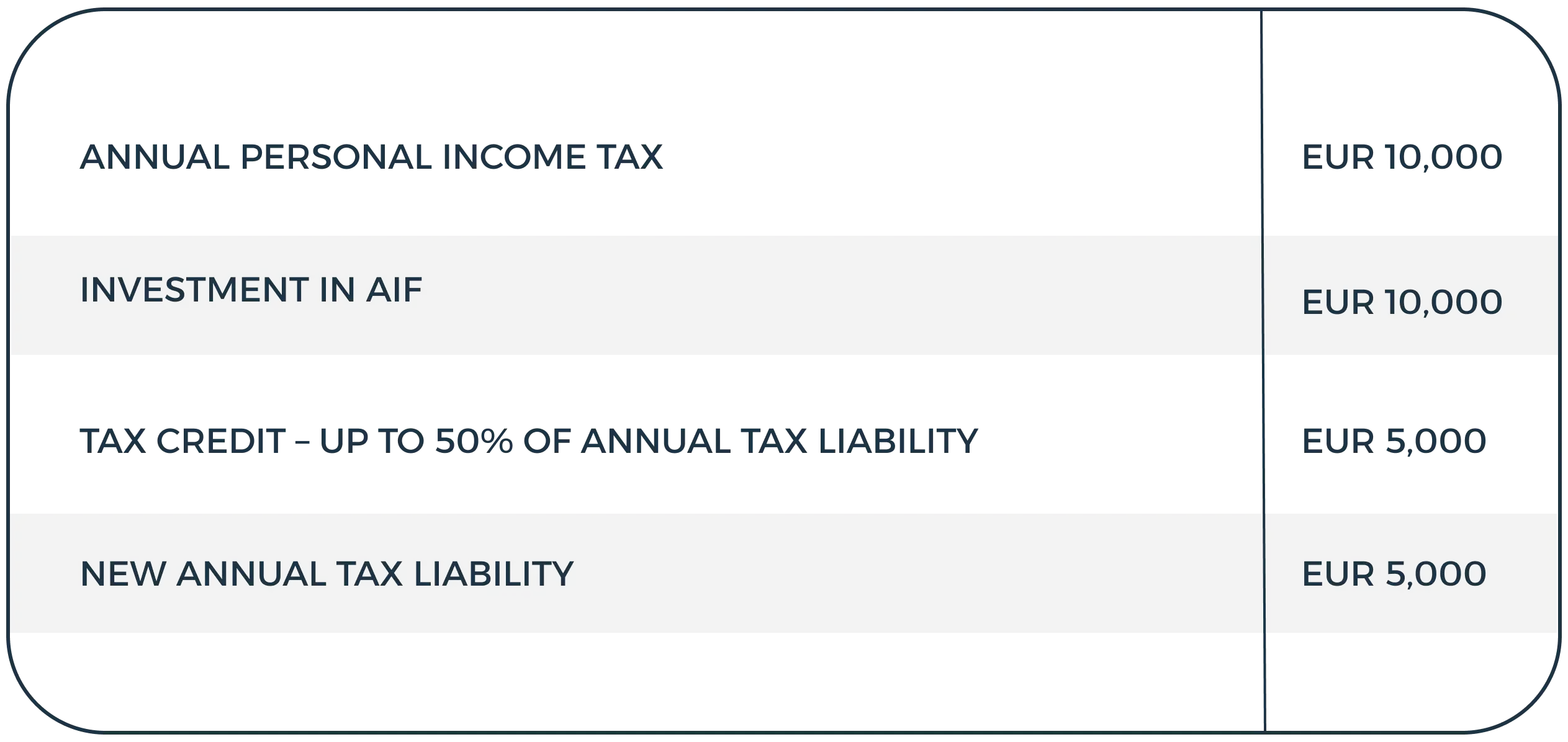 A client with an annual personal income tax obligation of EUR 10,000, upon investing in an alternative investment fund in the amount of their tax obligation, educes the obligation up to 50%. In our example by EUR 5,000.